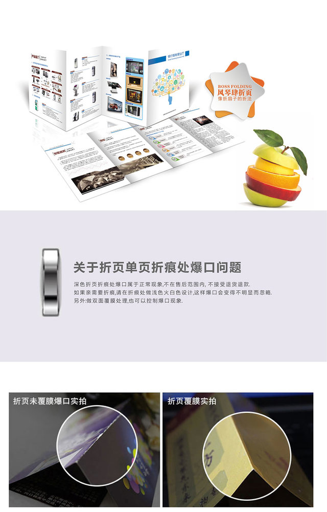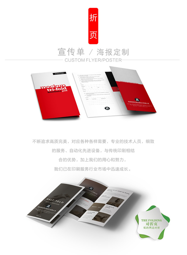 產品特點:根據展示的方式,折頁可以分為二折頁、三折頁、四折頁、扇形折頁、關門折頁、荷包折頁、普通的對折等形式!印刷紙張方面,一般采用105克、128克、157克、200克,甚至更高的250克的銅版紙,啞粉紙。紙張克數越大,硬度越大!