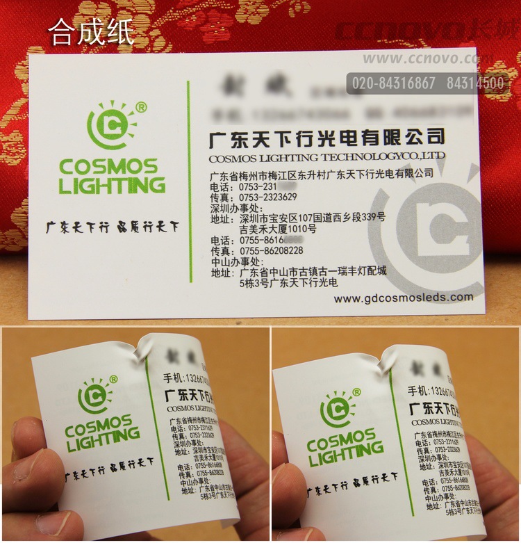 180克合成紙名片(撕不破)合成紙是紙與PP橡膠材質合成后的另一種材質,其材質韌性相當好,一般是無法撕爛,只有用剪刀才能剪斷,表面看其材質跟啞粉紙基本差不多;