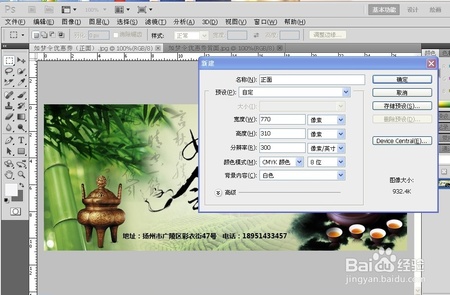 2,新建一個和原文件一樣大小的文件,在填寫信息的時候要注意。分辨率好選300px,顏色模式選擇CMYK顏色。都設(shè)定完后,選擇確定。